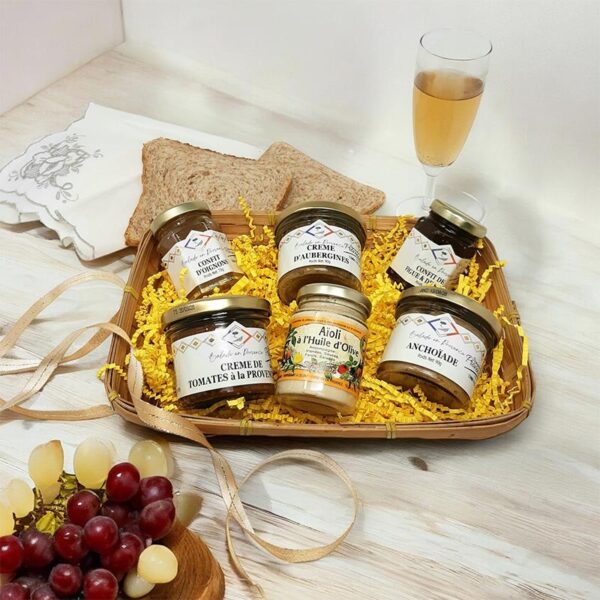Coffret de 5 specialites gastronomiques artisanales : terrine, confiture, miel, biscuits et huile d’olive AOP. Un tour de France des saveurs.
