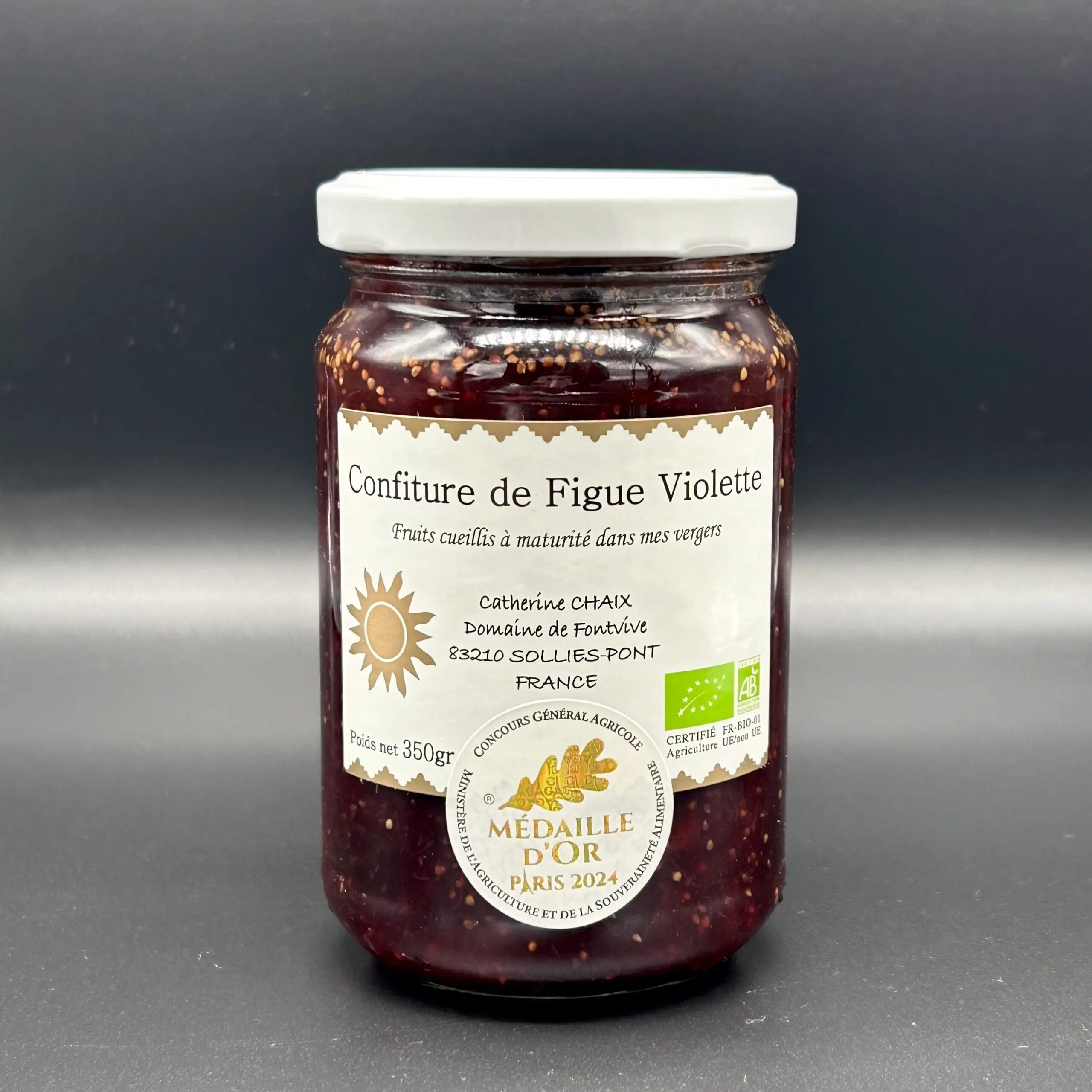 Figues violettes AOC de Sollies-Pont confites au chaudron avec miel de lavande de Provence. Texture onctueuse, aromes profonds.