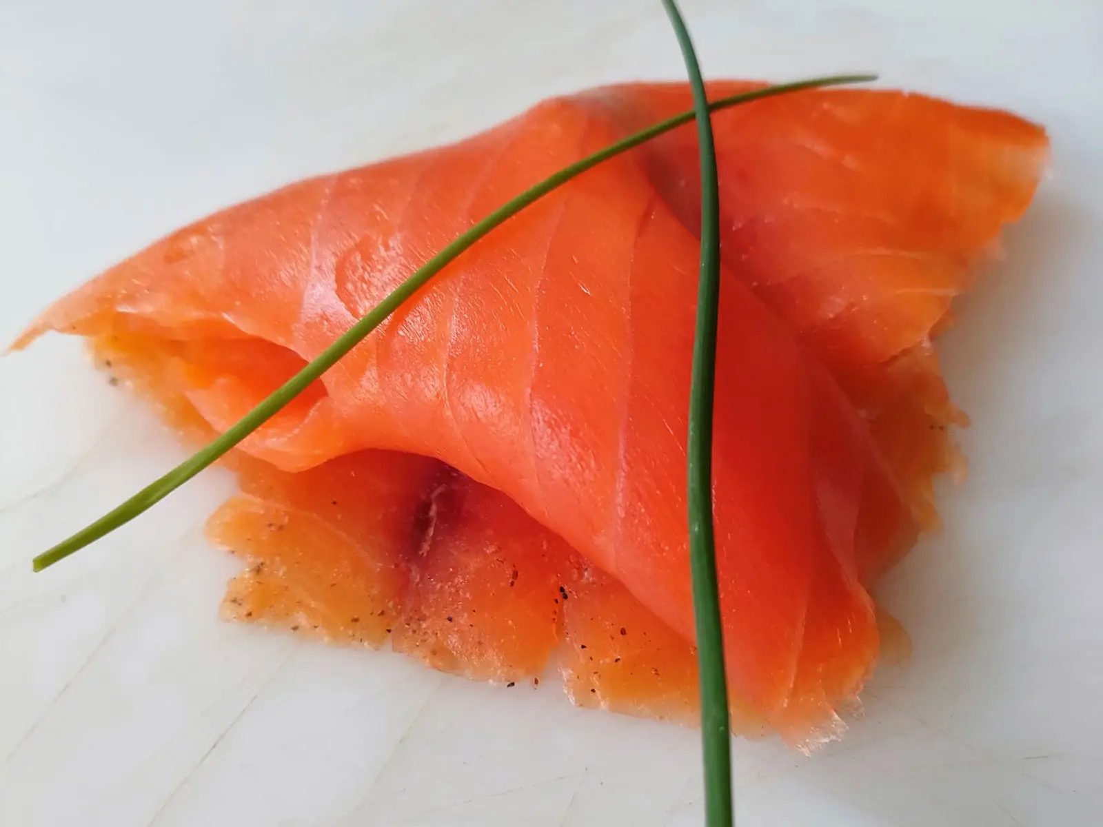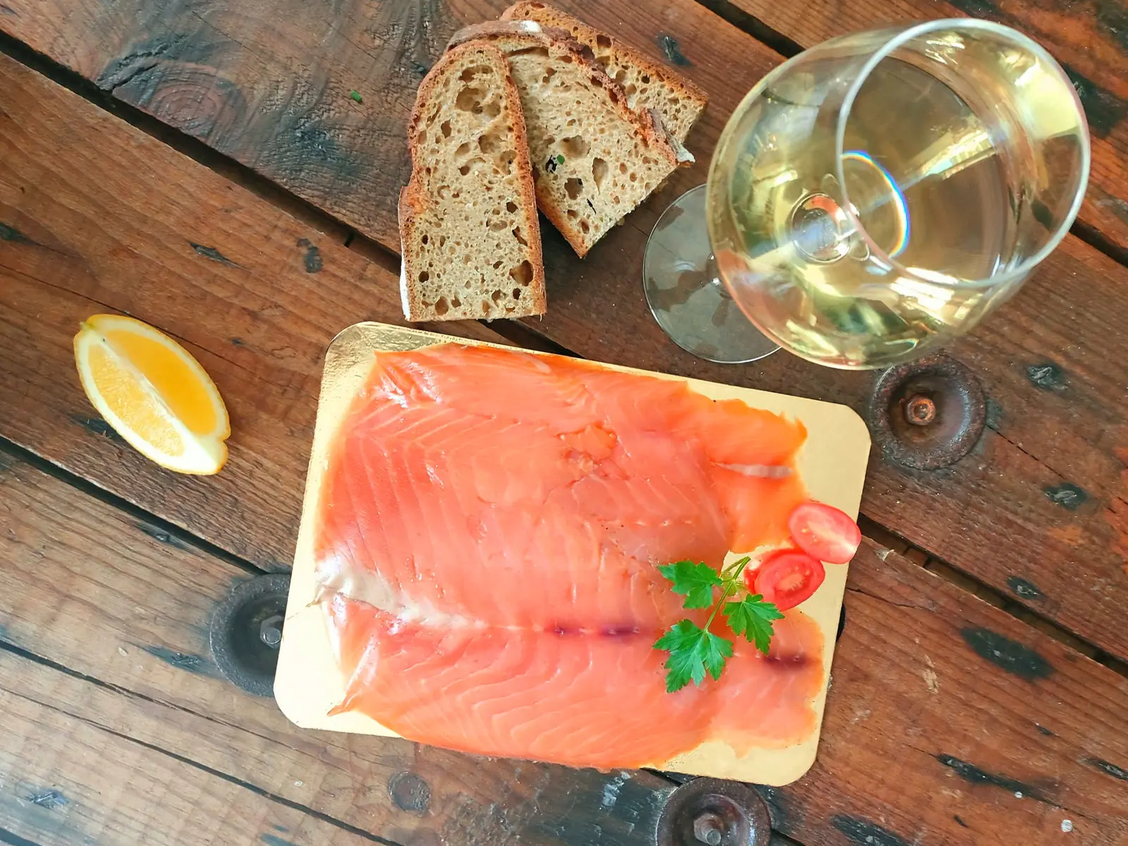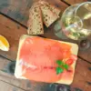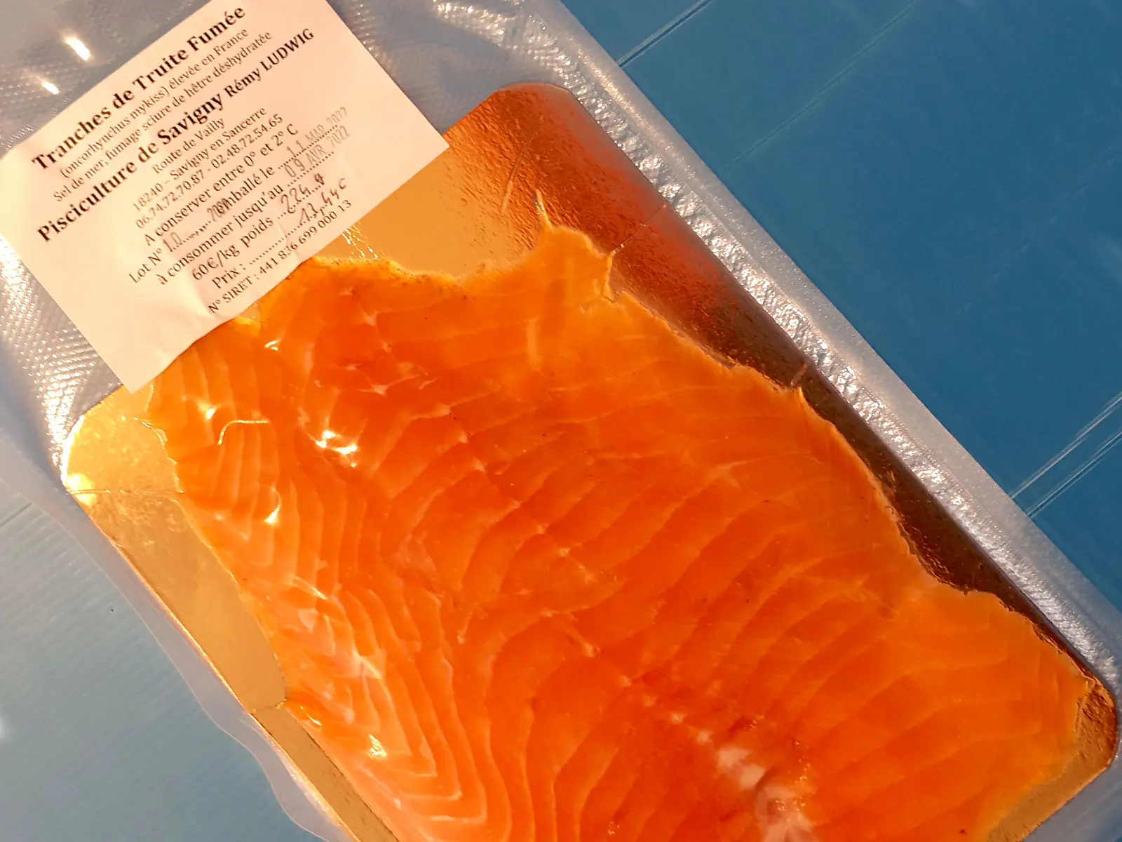 Truite arc-en-ciel d’elevage alpin fumee artisanalement au bois de cerisier. Chair rose et delicate aux aromes fruites et subtils.